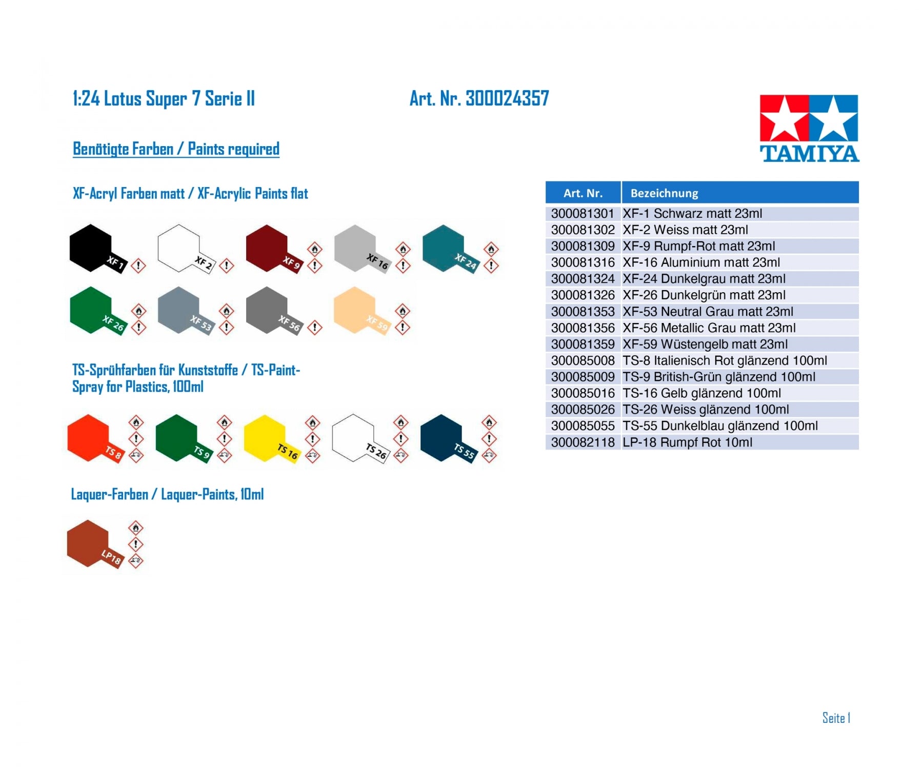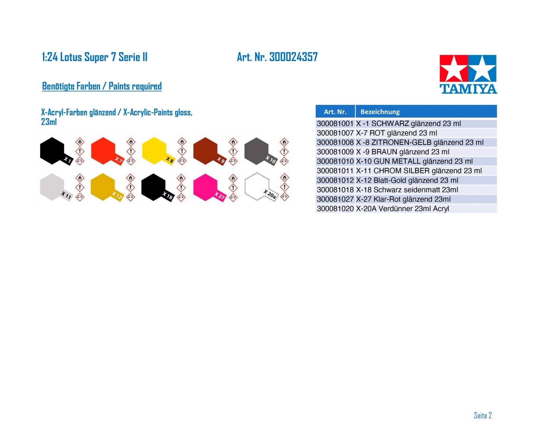 Der Tamiya-Modellbausatz im Maßstab 1:24 ermöglicht eine detaillierte Nachbildung des Reihen-Vierzylindermotors, wobei Vergaser, Auspuffanlage, Getriebe und Federung authentisch dargestellt werden. Aluminium-Luftansaugtrichter für den Motor sowie eine Vielzahl von Fotoätzteilen sorgen für ein ultrarealistisches Finish. Der Super 7 kann als Straßenauto oder Clubman Racer zusammengebaut werden.