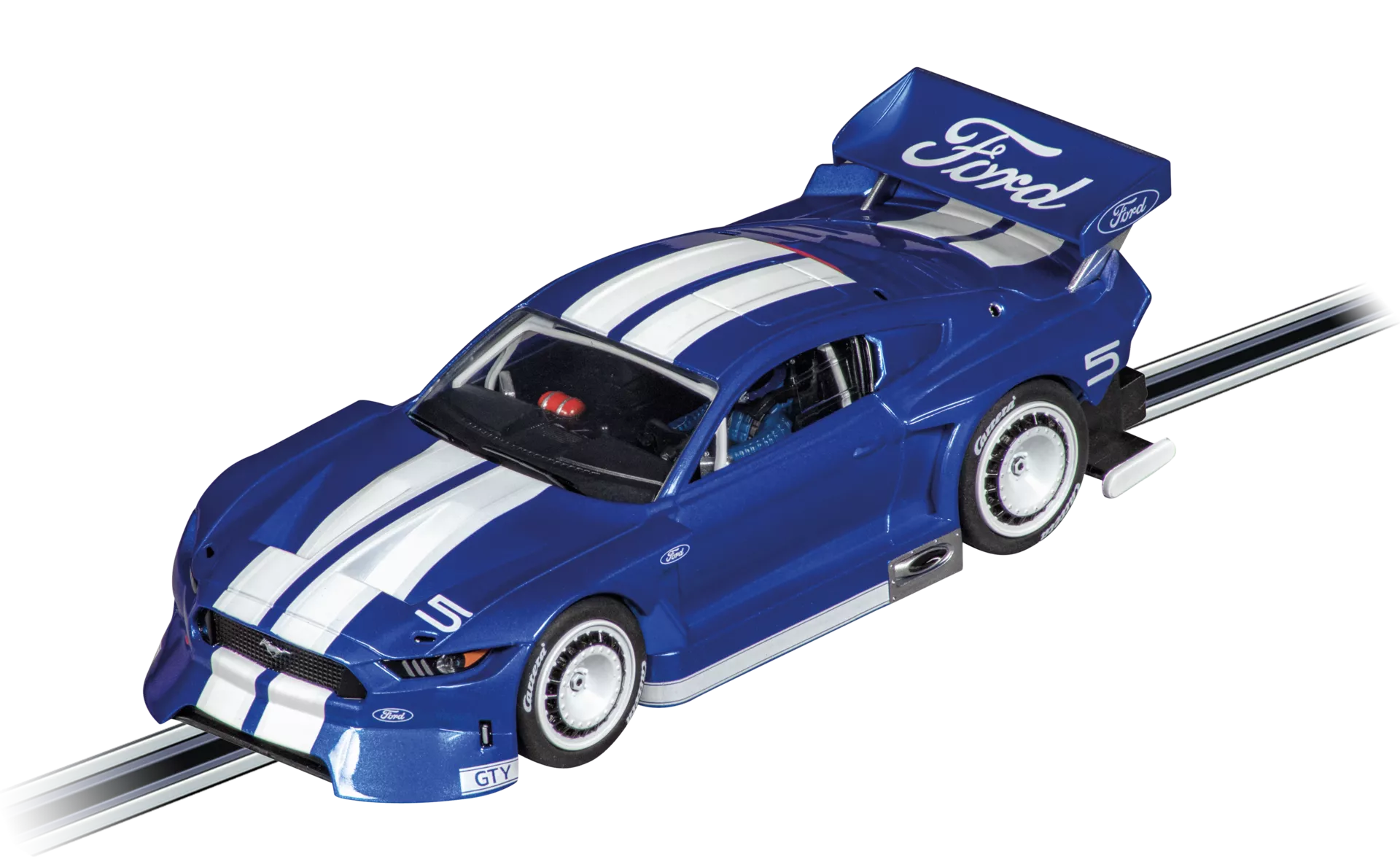 Seit 1964 gibt es den Ford Mustang und ist bis heute einer der ikonischsten Sportwagen der Welt – 2018 rollte bereits der 10-millionste Ford Mustang in Michigan vom Band. Das von Carrera modifizierte Modell des Ford Mustang GTY mit der Nummer 5 wurde extra für rasante Drift-Action auf der Rennschiene optimiert und kommt in den typischen Farben des amerikanischen Motorsports in blau und weiß.