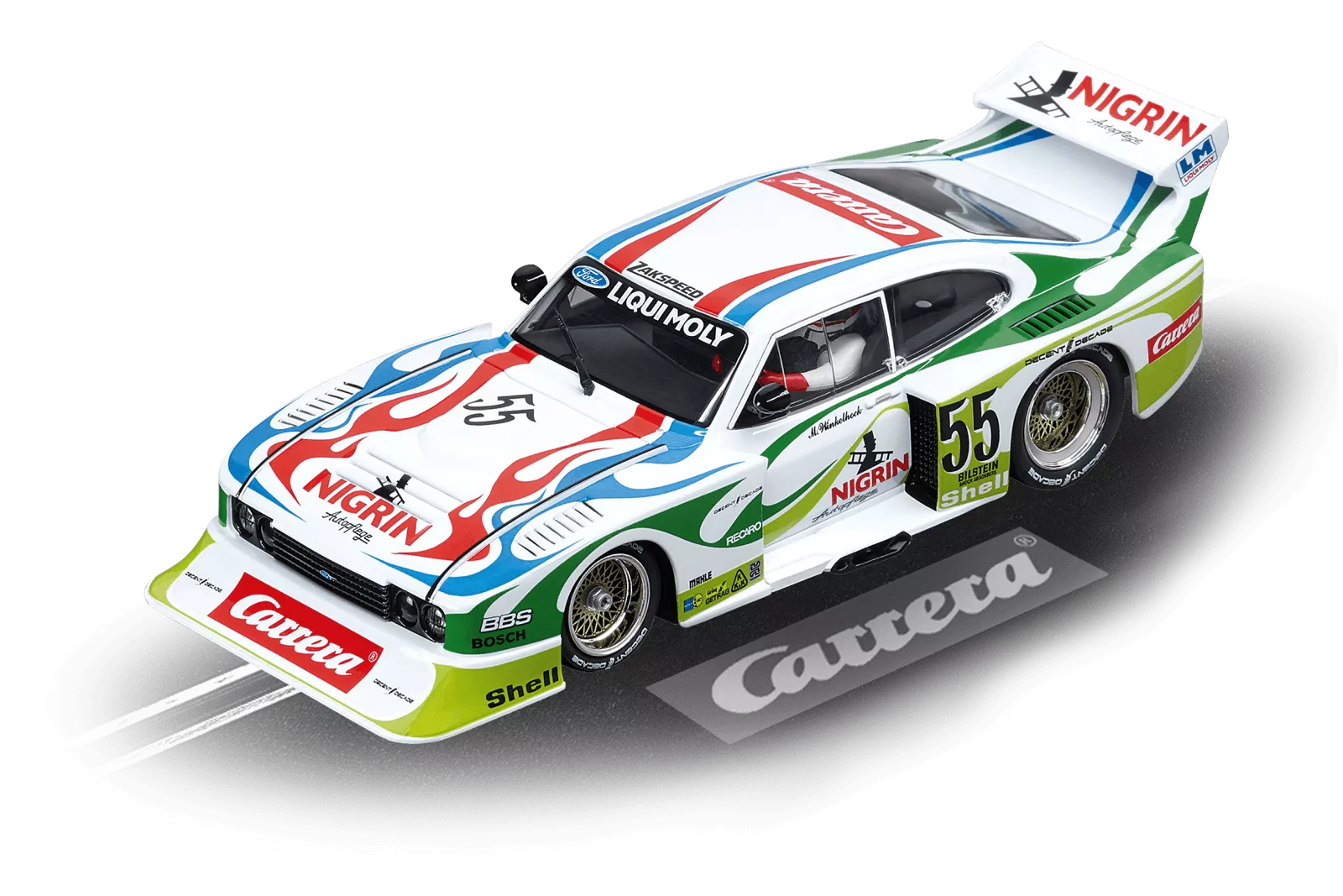 Unterstützung von Carrera Carrera gehört schon seit Jahrzehnten zu den großen Namen der Motorsportwelt und sponserte 1981 den Ford Capri Zakspeed Turbo des Rennfahrers Manfred Winkelhock. Dieser gewann am Steuer des Fahrzeuges das DRM-Rennen am Nürburgring. Das Design des Rennboliden ist in den Farben grün, weiß und rot gestaltet, wodurch das Carrera-Logo perfekt integriert ist. Das Carrera DIGITAL 132 Ford Capri Zakspeed Turbo "Liqui Moly Equipe, No.55" Slotcar begeistert durch Frontlicht und Rück- / Bremslicht sowie eine originalgetreue Verarbeitung. Das Carrera Auto ist individuell codierbar, digital steuerbar und bietet echten Fahrspaß.