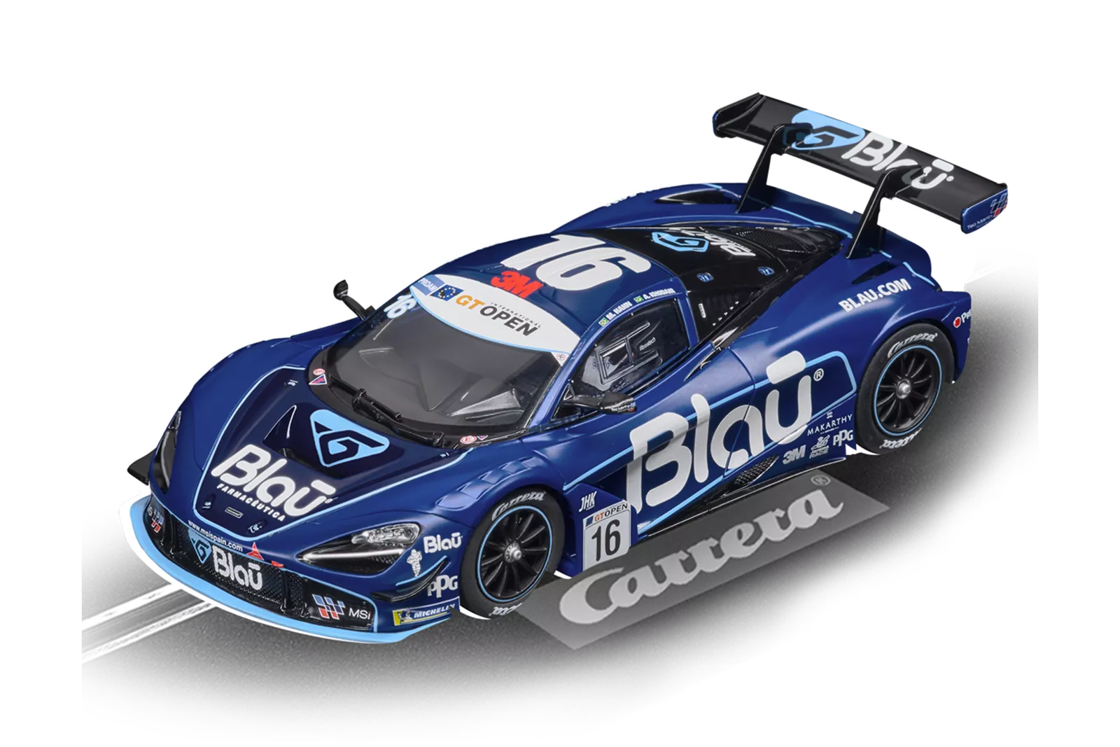 Mit dem McLaren 720S GT3 „No.16" kannst du auf deiner Carrera DIGITAL 132 Rennstrecke ordentlich Gas geben und die Konkurrenz an der Startlinie hinter dir lassen. Der Bolide ist eine Neuauflage des McLaren 720S und kam erstmals bei der International GT Open 2019 zum Einsatz. Der Supersportwagen musste extra für die GT Rennen angepasst und die unglaublichen 720 PS auf rund 500 PS gedrosselt werden. Der stylische Rennwagen mit matt-blauer Lackierung gewann bei der International GT Open im vergangenen Jahr das Rennen im italienischen Monza und das Team vom spanischen Rennstall Teo Martin Motorsport sicherte sich zusammen mit dem Schwesterauto bei der Team-Meisterschaft den soliden zweiten Platz.