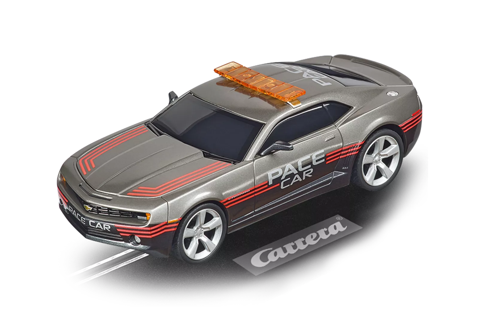 Mit dem Chevrolet Camaro Pace Car kommt ein legendäres Pony Car auf die Rennstrecke. Das mit einem V8-Motor und 400 PS ausgestattete Pace Car ist eine Hommage an den legendären Chevrolet Camaro, der beim Indy 500 in den 60er Jahren Rennen zum Einsatz kam. Im Maßstab 1:32 macht der bullige Rennwagen einiges her und dank der Blinklicht-Funktion ist der Flitzer schon von weitem sichtbar. Mit dem Chevrolet Camaro Pace Car sorgst du auf jeder Rennstrecke für Ordnung!