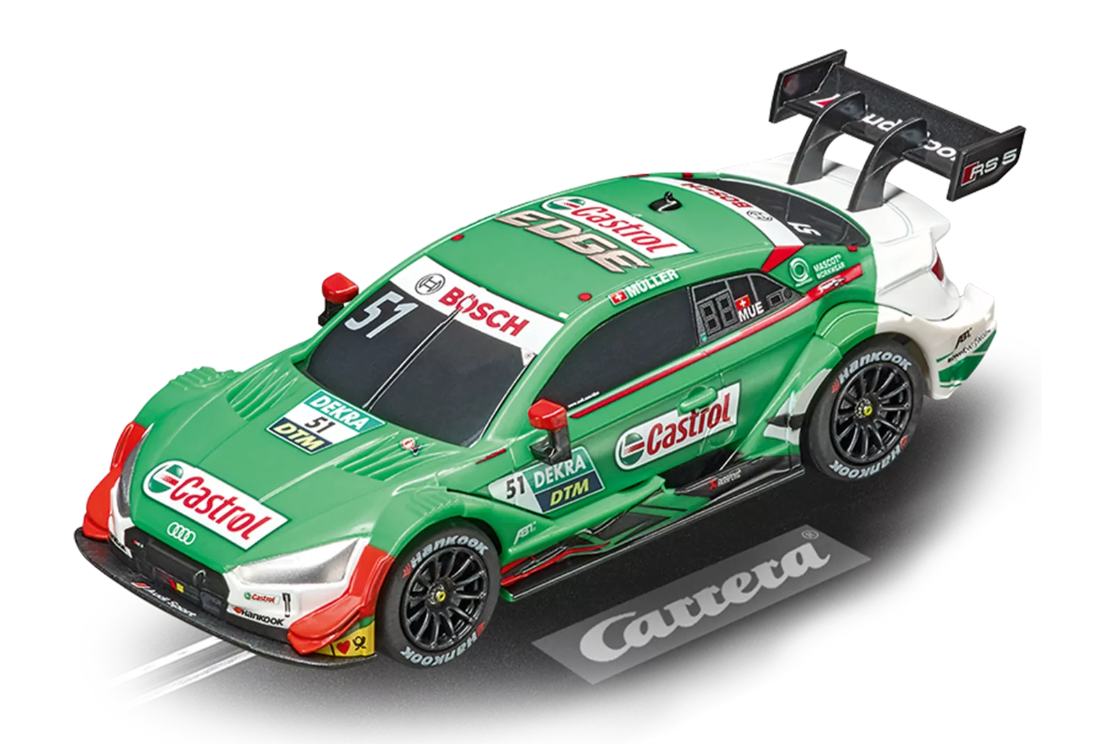 Dank der offiziellen DTM Lizenz düsen die brandaktuellen Flitzer der Saison 2019 über die berühmten Carrera Schienen. Nico Müller aus dem Audi Sport Team Abt Sportsline konnte mit dem zweiten Platz im letzten Jahr sein bisher bestes DTM-Ergebnis einfahren. Ob der Audi RS 5 DTM auf der heimischen Rennstrecke sogar den Sieg einfahren kann, entscheidest du allein am Handregler.