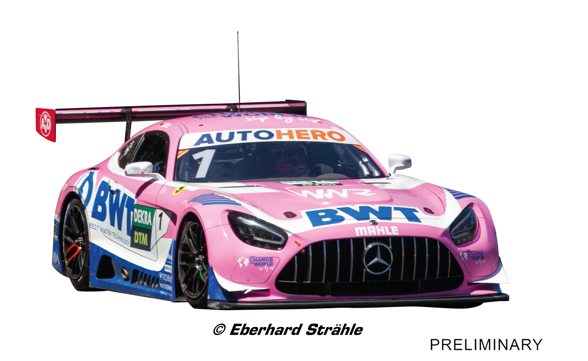 Der Mercedes AMG GT3 Evo ist ein moderner Klassiker des Tourenwagen-Rennsports. Der Carrera DIGITAL 132 Mercedes-AMG GT3 Evo „Mercedes-AMG Team Winward M. Götz” ist das aktuelle Fahrzeug des DTM-Meisters von 2021 Maximillian Götz. Der Meister ging mit dem neuen Fahrzeug und neuem Team in den Farben rosa-weiß-blau auch bei der DTM-Saison 2022 an den Start, konnte jedoch nicht an das Hoch aus der Vorsaison anknüpfen.