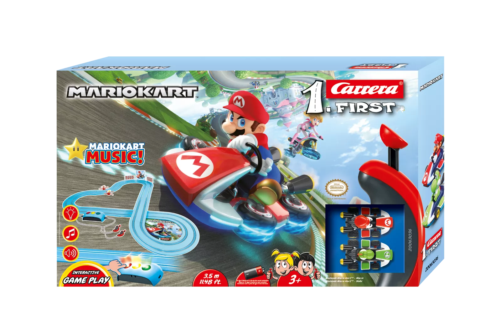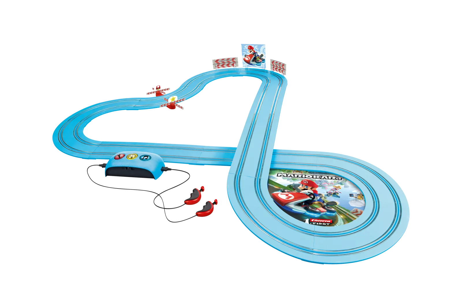 Sause mit Mario und seinem Kumpel Yoshi über die blauen Carrera FIRST Schienen. Für echtes Mario Kart-Feeling sorgt die integrierte Featurebox, die den bekannten Mario Kart-Sound auf Knopfdruck abspielt. Interaktive Spielfeatures bringen Mario und Yoshi zum Stoppen. Erst nach einem Druck auf den richtigen Knopf geht die schnelle Fahrt weiter.