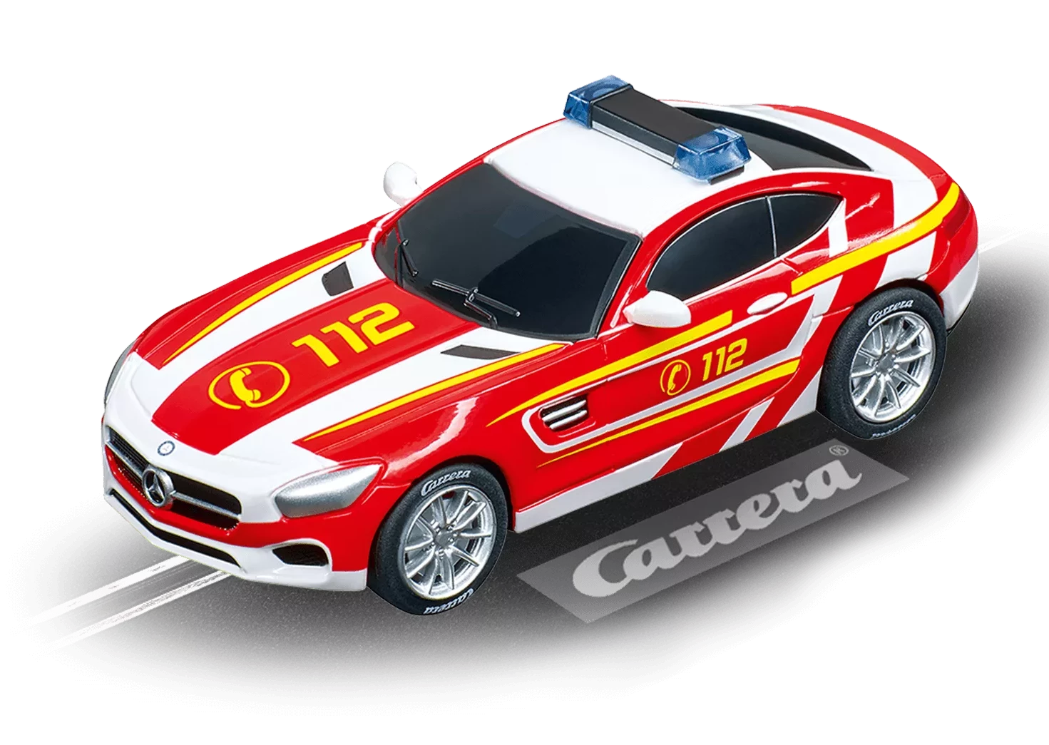 Die wichtige Arbeit der Feuerwehr ist auch auf der heimischen Rennbahn unverzichtbar. Im Falle eines Unfalls oder Brands rückt das Slotcar im Maßstab 1:43 aus, um die Situation unter Kontrolle zu bringen. Der Rennwagen ist dem Original dank der Mercedes-Lizenz detailgetreu nachempfunden und natürlich mit einem Blaulicht ausgestattet. Die Notrufnummer „112" ist auf die Karosserie lackiert. So wissen die anderen Fahrer immer ganz genau, dass Du als Feuerwehr mit Deinem Mercedes-AMG GT Coupé im Einsatz bist.
