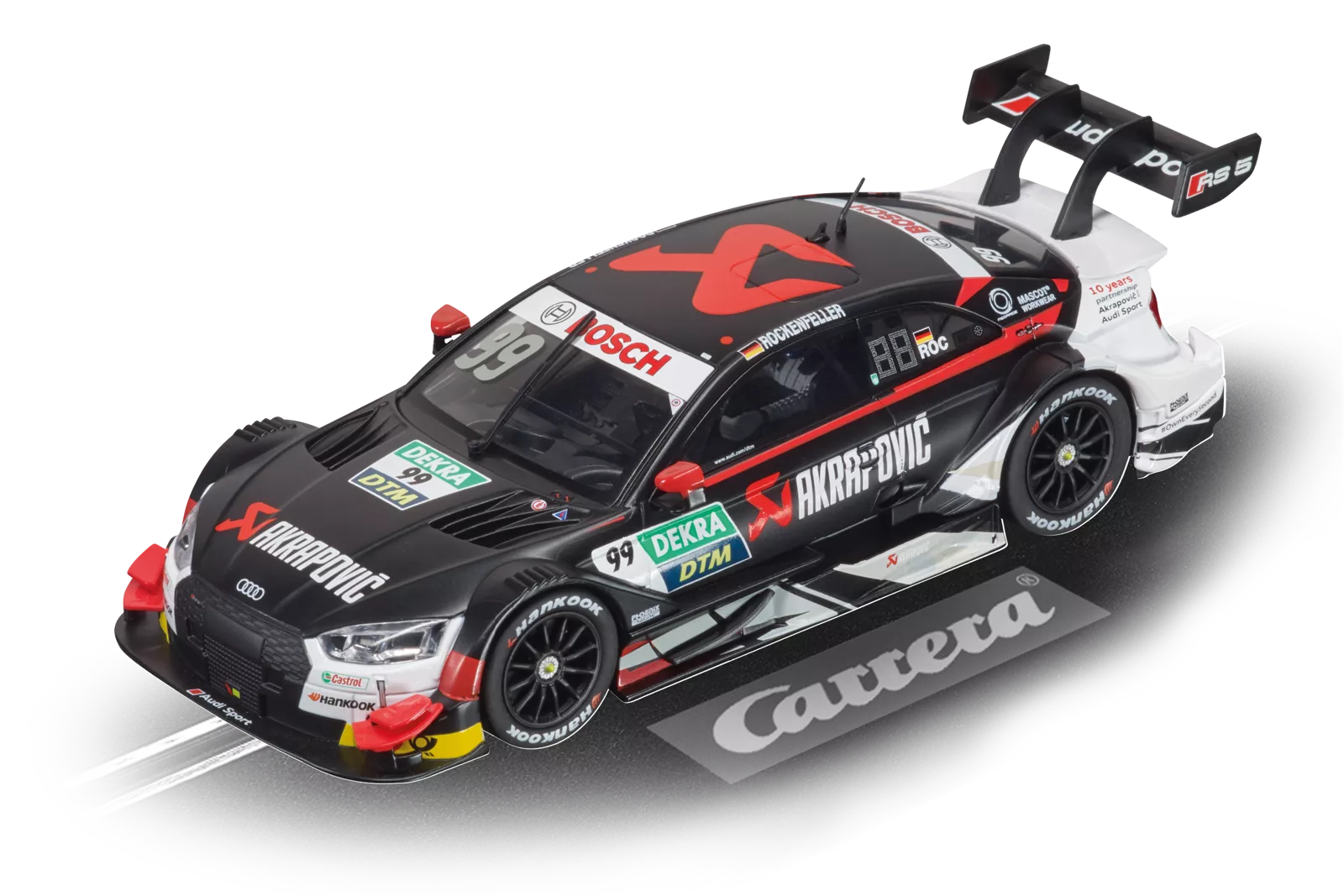 Audi, Mercedes oder doch BMW? Alle Fans von Mike Rockenfeller werden diese Frage leicht beantworten. Mit dem RS5 DTM liefert man sich auch im Maßstab 1:32 spannende Duelle mit seinen Gegnern. Das Slotcar im coolen Schwarz mit roten Elementen wurde detailgetreu dem Original nachgebaut und ist mit Front-, Rück- und Bremslicht ausgestattet. Das Carrera Fahrzeug ist individuell codierbar, digital steuerbar, aber auch analog einsetzbar.