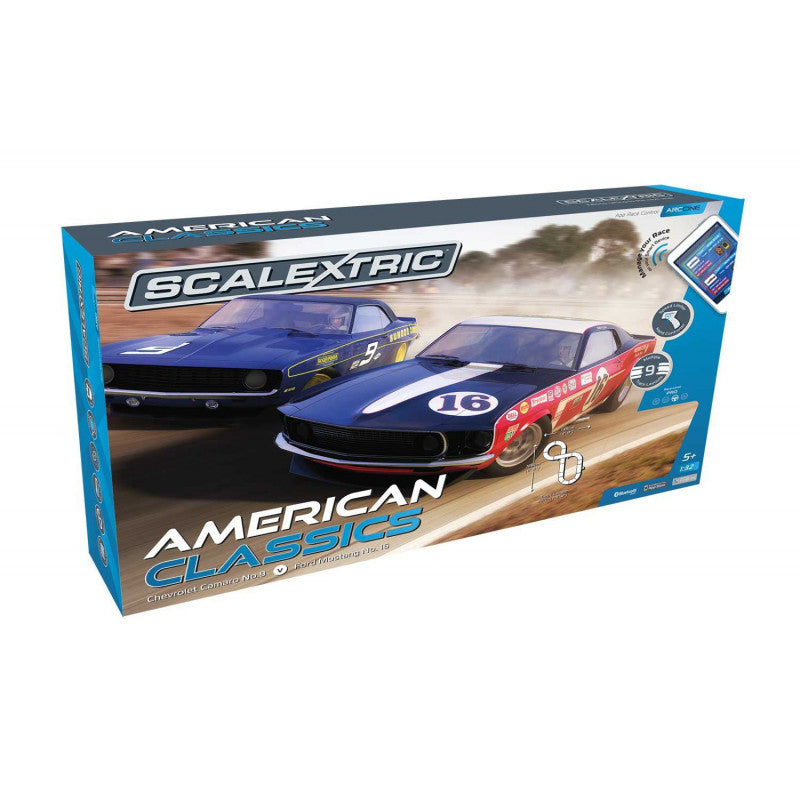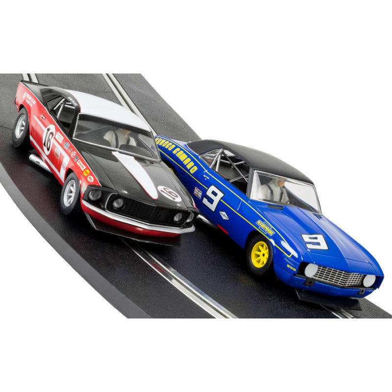 Zwei der bekanntesten amerikanischen Muscle-Cars sind in einem Scalextric-Set vereint. Der auffällige und legendäre Chevrolet Camaro von 1969 und der berüchtigte Ford Mustang Boss von 1969 treten gegeneinander an, aber wer wird in diesem Kampf der American Muscle die Nase vorn haben?