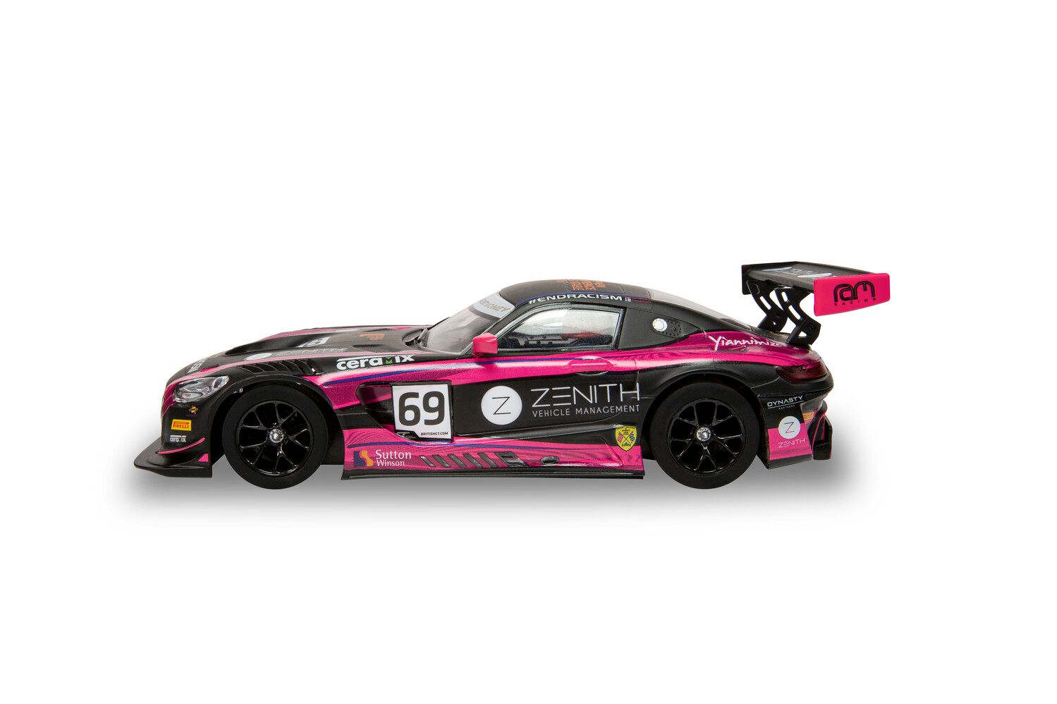 Für 2020 wurde der Mercedes AMG GT3 EVO vom jungen britischen Fahrer Sam de Haan zusammen mit dem finnischen Profi Patrick Kujala pilotiert. Die auffällige Lackierung mit Charity-Logos und Hashtags ist ebenso ein Blickfang wie die Chromlackierung. Beim Rennen in Brands Hatch fuhr das Duo ein tolles Rennen und belegte den 6. Platz in der Gesamtwertung. Dies ist eine neue Version des AMG GT3 für die Scalextric-Reihe 2021 mit einem aktualisierten Frontgrill und einem neuen Heckdiffusor, was ihn zu einem Auto macht, das jeden Konkurrenten auf Ihrer Rennstrecke in den Schatten stellen wird!