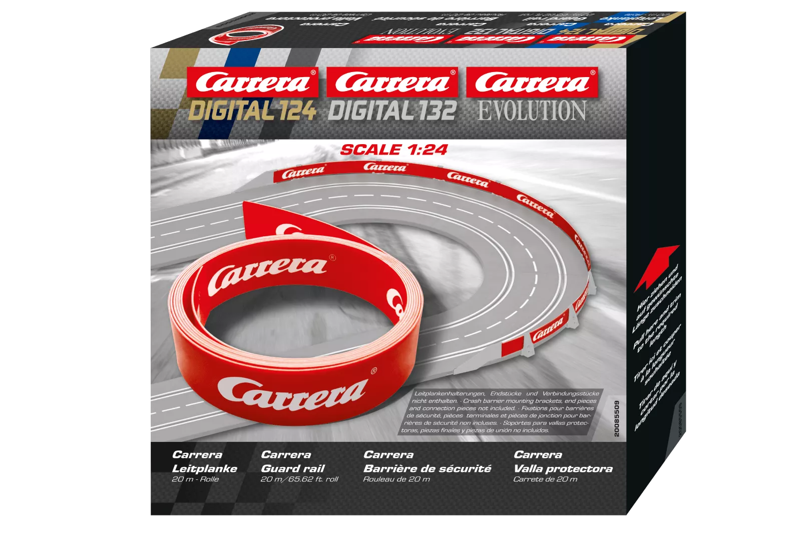 Leitplanken finden sich vor allem in kurvigen Abschnitten der Carrera Rennstrecke wieder. Bei hart umkämpften Kurven ist es im Laufe der Zeit notwendig, diese gegen neue auszutauschen. Aber vielleicht möchtest Du auch einfach nur einen neuen Look für Deine Leitplanken. Ganz gleich, aus welchem Grund: Mit dieser 20 Meter Rolle hast Du immer genügend Band für die Leitplanken parat. Das Material ist biegsam, lässt sich gut bearbeiten und auf die gewünschte Länge zuschneiden. Optisch überzeugt das Zubehör mit dem typischen Carrera Design - Logo und Farben sind schon auf den ersten Blick der Kultmarke zuzuordnen. Die Schutzplanke ist für Slotcarbahnen im Maßstab 1:24 geeignet und daher ideal für die DIGITAL 124, DIGITAL 132 und Carrera EVOLUTION. Leitplankenhalterung, Endstücke und Verbindungsstücke sind nicht enthalten.