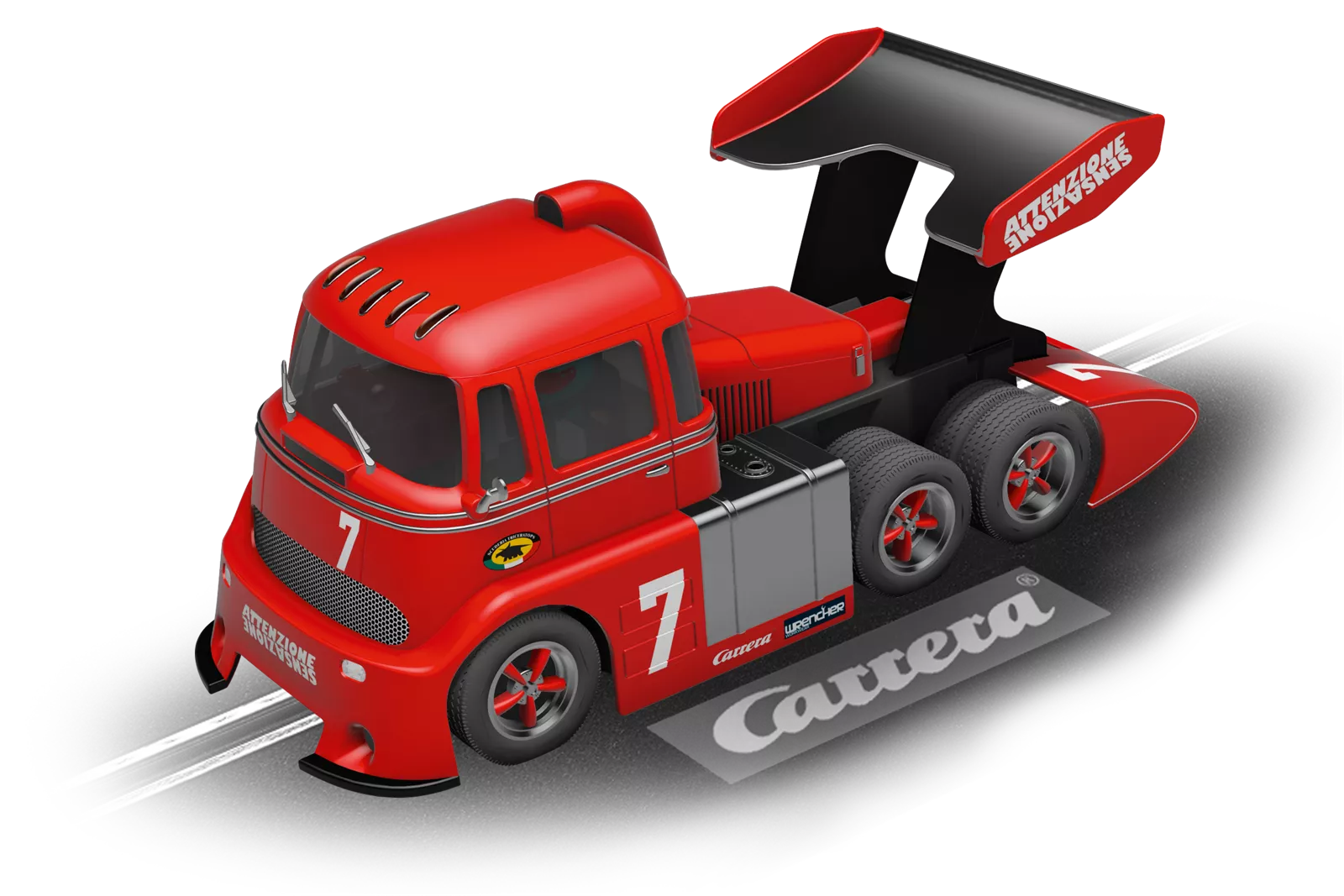 Im Rennen mit dem Carrera Race Truckster "No.7" zeigst du, wer beim Elefantenrennen auf der heimischen Rennstrecke den Rüssel vorne hat. Der rote Truckster mit seinem abgerundeten Fahrerhaus und dem großen Heckspoiler macht auf der Piste einiges her. Im Windkanal hast du mit dem Kraftprotz allerdings schlechte Karten: Windschnittigkeit gehört nicht zu seinen Vorzügen.