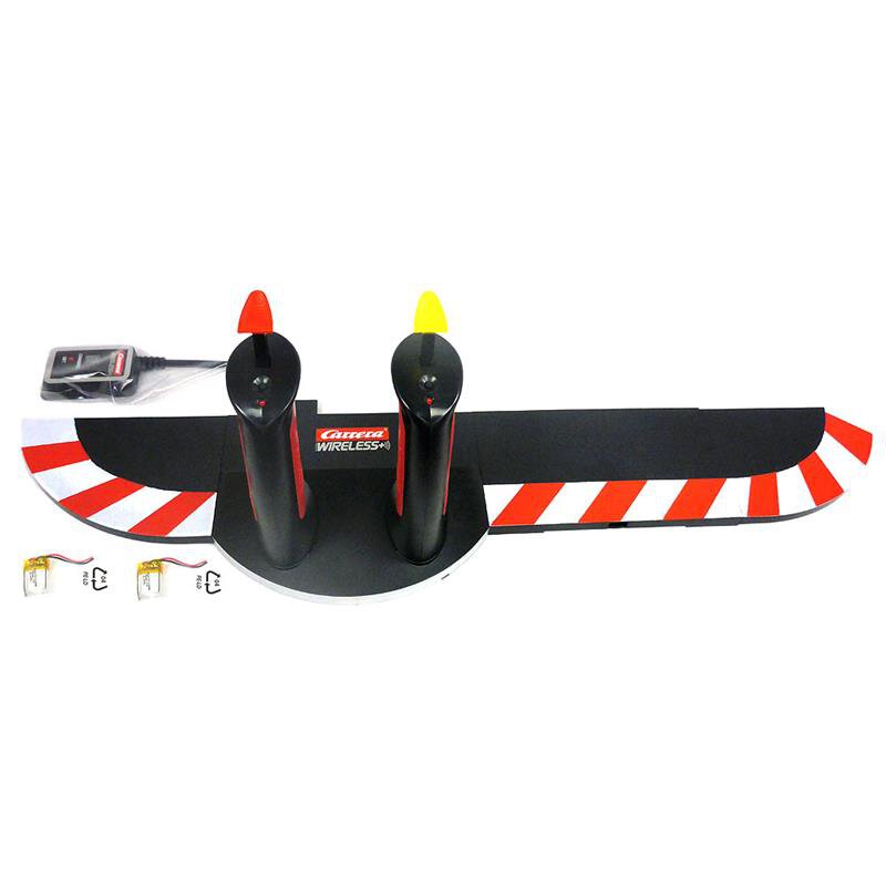 Der leistungsstarke Lithium Polymere Akku ermöglicht 8 Stunden Spielzeit im Dauerbetrieb – und bei geladenem Akku sogar 20 Tage im Standby-Betrieb. Das neue 2.4 GHz WIRELESS+ wird mit der Carrera Black Box oder der Carrera Control Unit betrieben. Am Receiver sind 6 unterschiedliche Fahrzeugadressen wählbar und die Steuerung erfolgt über ultraleichte, kabellose Handregler.