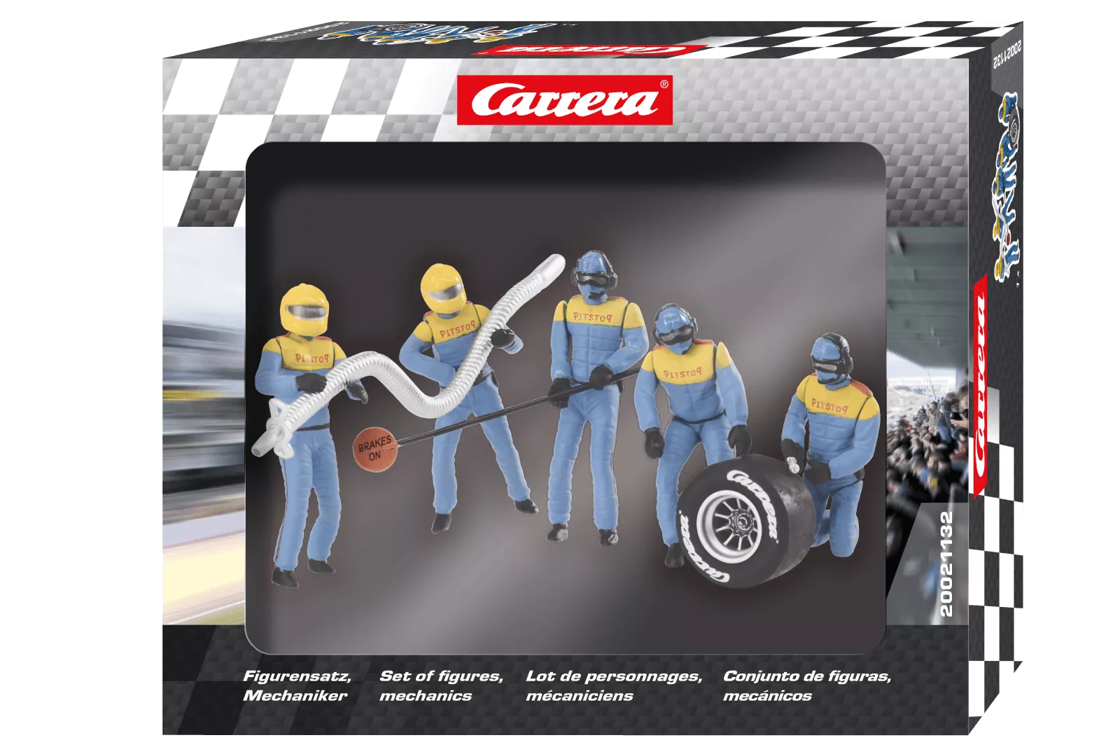 Das Rennauto muss zum Reifenwechsel oder zur Reparatur in den Boxenstopp? Gut, dass das Mechaniker-Team zur Stelle ist und dafür sorgt, dass es so schnell wie möglich wieder zurück auf die Rennstrecke gehen kann! Der Mechaniker-Figurensatz macht Deine Carrera Rennbahn noch lebendiger und sorgt für eine Extraportion Authentizität. Die colorierten Figuren begeistern mit ihrer sehr genauen Ausarbeitung und den verschieden positionierbaren bzw. drehbaren Körperteilen. Im blau-gelben Design machen die fünf Mechaniker auf Deiner Rennbahn eine super Figur und schaffen ein noch realistischeres Ambiente!