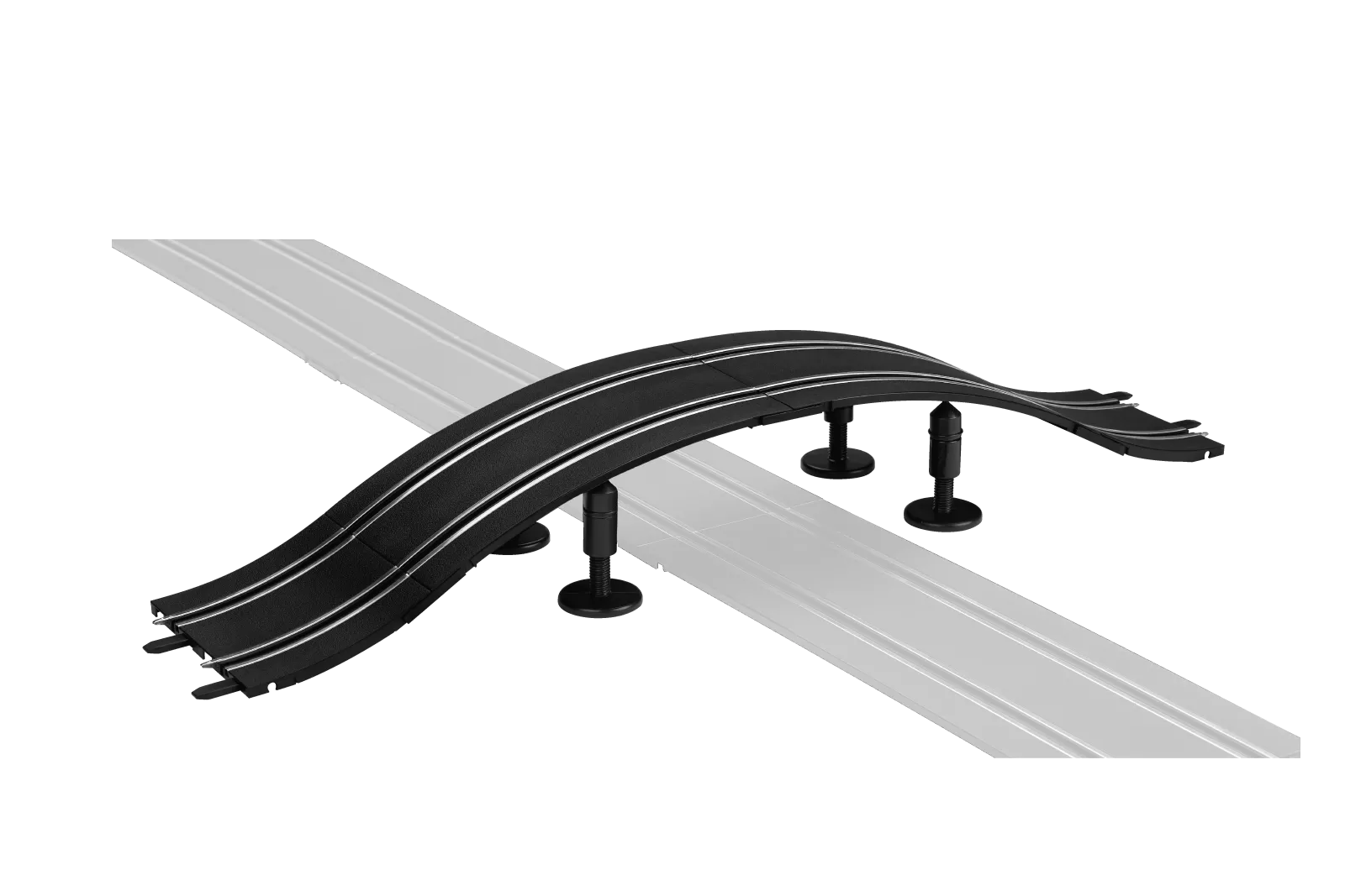 Mit diesem Zubehörset hast Du mehrere Möglichkeiten, um Deiner Carrera Rennbahn noch mehr Fahrvergnügen einzuhauchen. Du kannst die Schienenteile entweder als brückenähnliche Überfahrt oder als Kamelbuckel aufbauen. Insgesamt vier kurze konkave Schienenteile, zwei lange konkave Schienenteile, zwei konvexe Schienenteile können mit zwölf Schienenclips miteinander verbunden werden. Den Übergang kannst Du über einen geraden Abschnitt Deiner Slotcarbahn legen. Die vier Stützen sorgen dafür, dass der Aufbau genügend Halt hat und die darunter fahrenden Autos nicht behindert werden. Alternativ kannst Du aus den Einzelteilen auch einen rasanten Kamelbuckel bauen und diesen als zusätzlichen Streckenabschnitt in Deine Carrera Bahn integrieren. Egal für welche Variante Du Dich entscheidest, von nun an heißt es Gas geben, denn die Erhöhungen erfordern einen kleinen Speed-Kick von Dir und Deinem Slotcar. Geeignet ist der Kamelbuckel/die Überfahrt mit ihren Schienen im Maßstab 1:43 für die Carrera GO!!!, die Carrera GO!!! PLUS und die Carrera DIGITAL 143.
