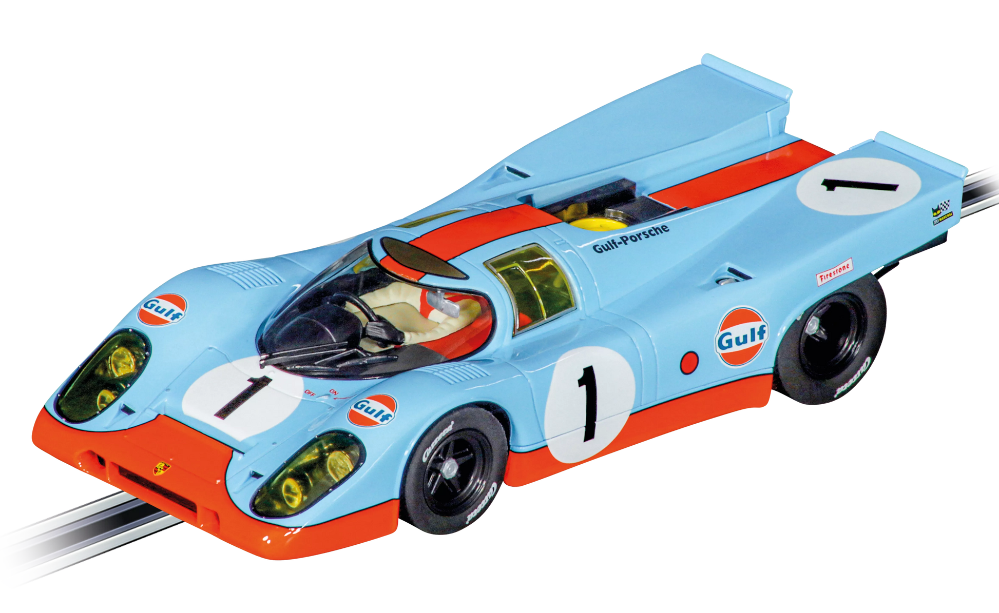 Mit dem Porsche 917 KH „J.W. Automotive Engineering, No.1“ Daytona 24h 1970 ist das berühmte Trio der Gulf Porsche 917 bei Carrera komplett. Das Slotcar begeistert dich im Maßstab 1:24 mit Frontlicht, Rück- / Bremslicht und Blinklicht. Digital fahrbar und individuell auf das Können der Fahrer codierbar bietet der Kultwagen der 1970er auch heute noch Fahrspaß.
