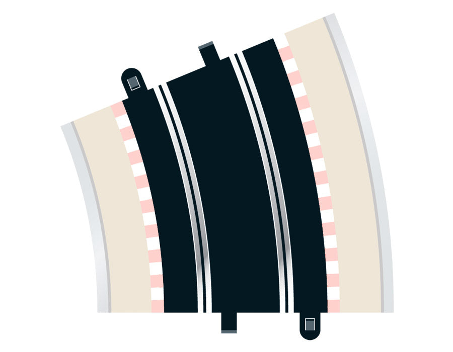 Inhalt: Radius 4 Curve 22,5 Grad x 2. Aufsteckbare Scalextric-Schiene für schnellen und einfachen Streckenbau. Verbinden Sie die moderne Scalextric-Schiene mit der Originalschiene (mit ringförmigen Anschlüssen) mit dem C8222 Converter Straight. Abgebildet mit: C8282 Radius 4 Inner Borders 22,5° und C8238 Radius 4 Outer Borders 22,5° (nicht im Lieferumfang enthalten).
