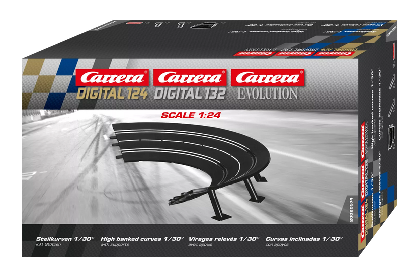 Steilkurve für Carrera Rennbahnen mit dem Maßstab 1:24DIGITAL 124, DIGITAL 132, Carrera EVOLUTIONFür noch mehr Action und Spannung auf der RennbahnPackungsinhalt: 6 Stück (je 30 Grad) = 180 Grad, Stützen