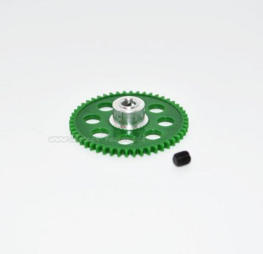 1 x Hinterachshalter (88711) , 2 Kugellager, 65 mm Achse gehärtet, 2 Distanzen a´2 mm, 2 Distanzen a´3 mm, Kunstoff Spurzahnrad 50 Zähne,